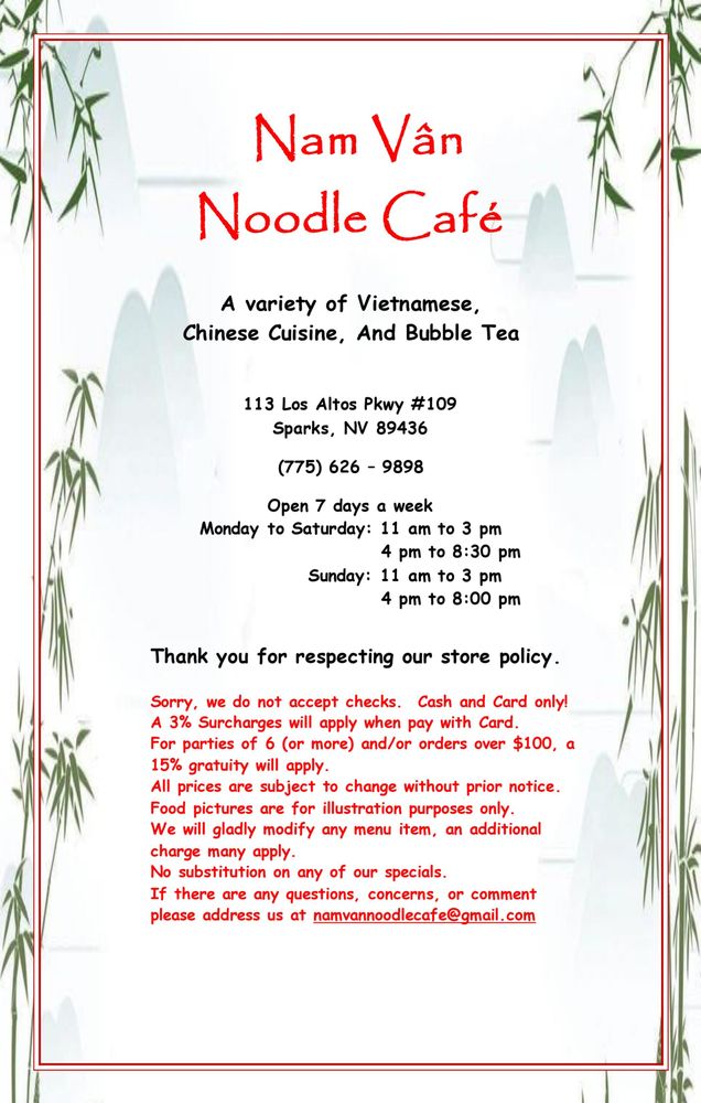 Nam Van Noodle Cafe in Sparks offers a fusion of Vietnamese and Chinese cuisine, specializing in noodles. With a range of vegan and vegetarian options, the menu caters to diverse dietary preferences. The restaurant provides a casual dining experience, perfect for lunch or dinner. Customers praise the flavorful dishes like the Wor wonton soup and chicken pho. The cafe's impeccable cleanliness and friendly service make it a favorite among locals. Highlights include the delicious spring rolls and the variety of boba flavors available. The lavender hot tea with steamed milk and Vietnamese coffee are must-tries. Overall, Nam Van Noodle Cafe is a hidden gem for authentic Asian comfort food with a welcoming atmosphere.