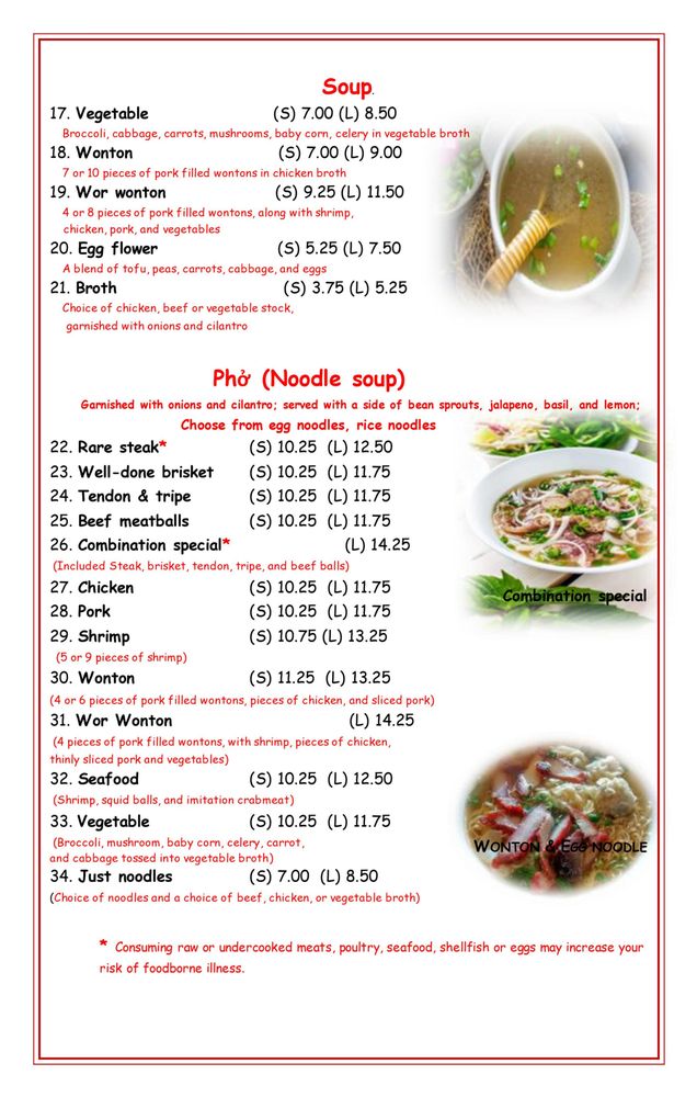 Small: 3.90 Large: 5.45 (Choice of chicken, beef, or vegetable stock)